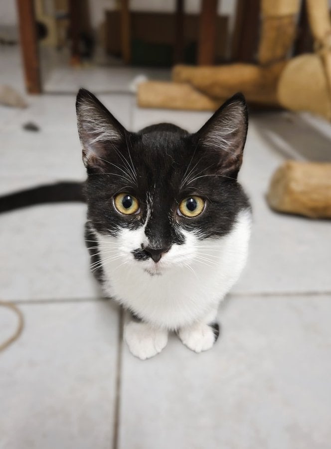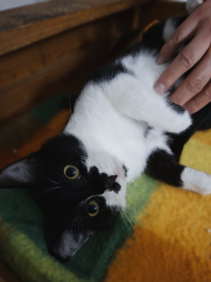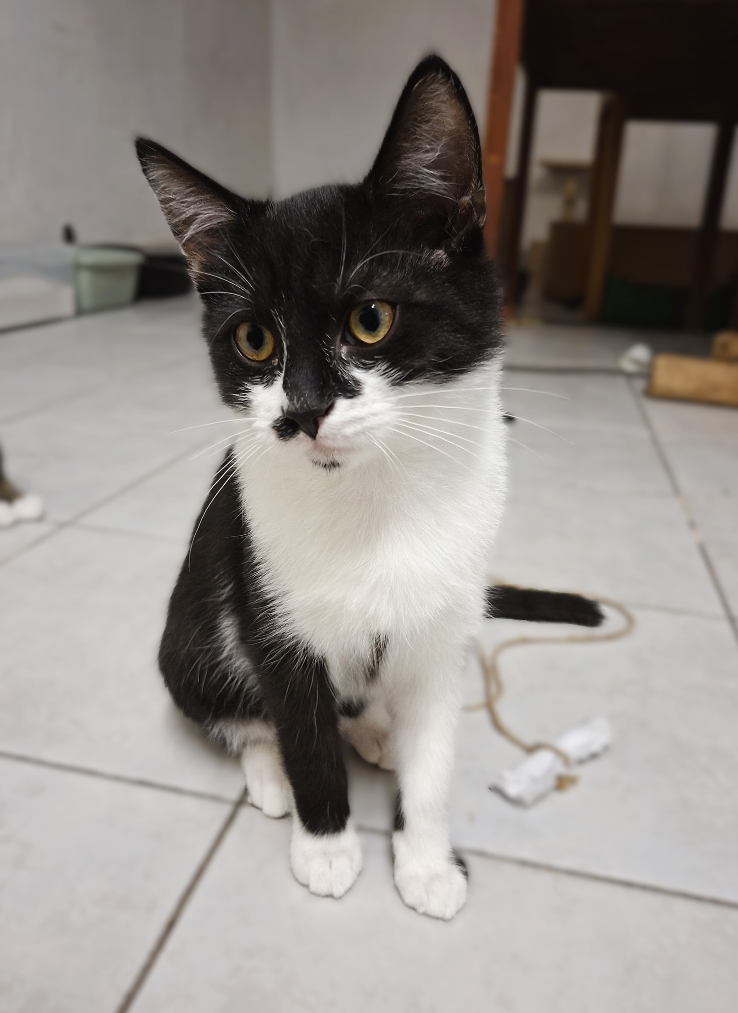 Batman je trochu stydlivý černobílý kocourek. Jak jde ale o jídlo, nic ho nezastaví. A při hraní se sourozenci také ne. Už se rozmazluje. Až vyroste, bude to pořádný kluk.